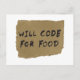 Coder in search of work...will code for food. Money is optional. Great for programmers, computer scientists and engineers in search of employment, food, or just a great laugh.