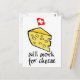 (multiple products selected) A humourous cartoon wedge of holey Swiss cheese sits proudly on a plate with a tiny Swiss flag atop it.