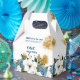 Elegant, romantic and beautiful watercolor floral details in dusty blue, cobalt and white. Customizable Will you be my bridesmaid typography, couple’s initials and wedding date on white background with dusty gold splatters throughout the favour box.