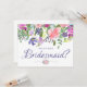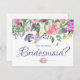Lovely way to ask a friend to be your bridesmaid. Pink and purple watercolor flowers surrounded by a variety of greenery create a beautiful keepsake bridesmaid card. The back of the card contains beautiful typography and the small floral posy at the bottom. This bridesmaid card is part of the Promise of Spring Wedding Suite. You should be able to see coordinating items and a link on this page. If you don't just copy the following link and paste it in your browser: https://www.zazzle.com/collections/promise_of_spring_wedding_suite-119632933934202901