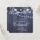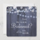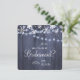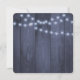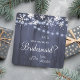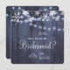 Personalized will you be my bridesmaid | maid of honour | flower girl editable text card featuring rustic white snowflakes and shimmering hanging string of lights on dark blue grey barn wood background. Ideal for your winter elegant rustic country | wonderland themed wedding.