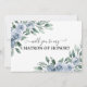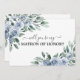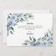 Design features elegant watercolor greenery with boho dusty blue rose floral elements. Design also features a modern typography font layout.