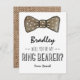Country tweed ring bearer card with a rustic burlap spotted bow tie, simple wording and a brown tweed fabric pattern on the reverse. These easily customizable wedding cards can be changed to suit your requirements, from adding your own personal message, to changing the font and colour.