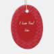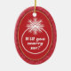 This Christmas tree ornament features a marriage proposal theme. The background is red with a light red heart pattern, the centre features a white circle with a snowflake on top to represent a diamond right, inside the ring is the text: Will you marry me? The backside features customizable text for you to add a message and your name.