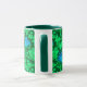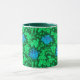 Coffee mug in a vintage William Morris floral damask pattern of anemone flowers and leaves, digitally enhanced and coloured - emerald green leaves, and flowers in shades of cerulean and cobalt blue on a dark emerald green background