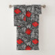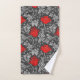 Towel set in a vintage William Morris floral damask pattern of anemone flowers and leaves, digitally enhanced and coloured - light silver grey / grey leaves, and flowers in shades of deep lipstick red on a dark graphite grey background