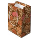 Gift bag in a vintage William Morris, Art Nouveau, floral print of stylized chrysanthemums, digitally enhanced and coloured, in tan, rust terracotta, and coral, on a deep chocolate brown background