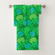 Serviette dans un vintage William Morris, Art Nouveau, imprimé floral de chrysanthèmes stylisés, numériquement rehaussés et colorés, en vert citron clair et profond et aqua, sur un arrière - plan vert émeraude