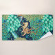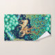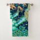 Towel set in a William Morris tapestry design of three deer beside a brook in a fantasy forest setting of trees in shades of soft green and aqua, against a dark indigo blue background