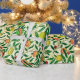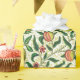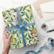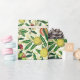 Wrapping paper in a William Morris Art Nouveau pattern of lemons, pomegranates, and peaches, with blossoms, on leafy branches - fruit in yellow and coral orange, with green leaves, against a patterned, yellow and white background