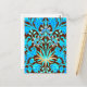 Postcard in a vintage William Morris pattern of hyacinths, tulips and leaves, in shades of soft aqua and cerulean blue, accented with coral pink and orange, on a dark chocolate brown background