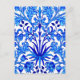 Postcard in a vintage William Morris pattern of hyacinths, tulips and leaves, in shades of cobalt and cerulean blue, accented with dark navy, on a white background