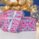 Wrapping paper in a vintage William Morris pattern of hyacinths, tulips and leaves, in shades of fuchsia and soft pink, accented with dark blue and turquoise, on a white background
