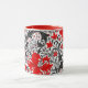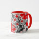 Coffee mug in a vintage William Morris floral print of stylized lilies and Irises, digitally enhanced and coloured, in shades of grey / grey and black foliage, with deep red flowers,on a white background