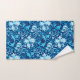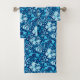 Towel set in a vintage William Morris floral print of stylized lilies and Irises, digitally enhanced and coloured, in shades of sky blue and white on a dark indigo blue background