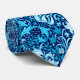 Tie in a William Morris floral print of stylized lilies and Irises, digitally enhanced and coloured, in shades of sky blue and white on a dark indigo blue background