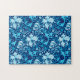 Puzzle in a vintage William Morris floral print of stylized lilies and Irises, digitally enhanced and coloured, in shades of sky blue and white on a dark indigo blue background, digitally coloured and enhanced