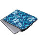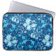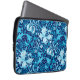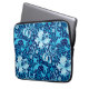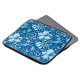 Computer sleeve in a vintage William Morris floral print of stylized lilies and Irises, digitally enhanced and coloured, in shades of sky blue and white on a dark indigo blue background, digitally coloured and enhanced