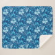 Sherpa Blanket in a vintage William Morris floral print of stylized lilies and Irises, digitally enhanced and coloured, in shades of sky blue and white on a dark indigo blue background, digitally coloured and enhanced