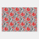 Wrapping paper in a vintage William Morris floral print of stylized lilies and Irises, digitally enhanced and coloured, in shades of grey / grey and black foliage, with deep red flowers, on white, shades of grey / grey and white on black, and shades of sky blue and white on dark indigo blue