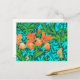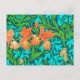 Postcard in a William Morris, Art Nouveau, textile print of irises and leaves, digitally enhanced and coloured, in orange, lime green, and soft aqua, on a deep turquoise background