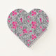 Heart shaped notebook in a William Morris textile print of irises and leaves in fuchsia and light pink, with graphite and medium grey / grey leaves, on a light silver grey background , with personalized monogram