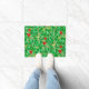 Doormat in a William Morris Art Nouveau textile pattern of lychee tree branches and leaves, in shades of lime and deep green, accented with red lychee fruits and yellow blossoms, on a light green background