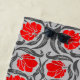 Beach towel in a vintage William Morris textile pattern of stylized pimpernel flowers and leaves - flowers in a gradient of dark to bright red, with graphite grey / grey leaves, on a light silver grey background