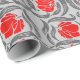 Wrapping paper in a vintage William Morris textile pattern of stylized pimpernel flowers and leaves - flowers in a gradient of dark to bright red, with graphite grey / grey leaves, on a light silver grey background