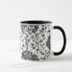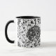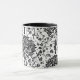 Coffee mug in a William Morris Art Nouveau take on a traditional "tree of life" pattern, featuring fantasy trees surrounded by branches filled with exotic flowers and birds, black and shades of grey / grey, on a white background