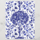 Paper in a William Morris Art Nouveau take on a traditional "tree of life" pattern, featuring fantasy trees surrounded by branches filled with exotic flowers and birds, in shades of cobalt blue and deep navy on a white background