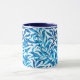 Mug in a vintage William Morris pattern of stylized willow branches, in shades of cobalt and cerulean blue with dark indigo, on a white background