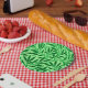 Paper plates in a William Morris Art Nouveau textile pattern of stylized willow branches and leaves in shades of deep jade green on a light jade green background