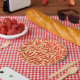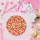 Paper plates in a William Morris Art Nouveau textile pattern of stylized willow branches and leaves in shades of mandarin orange on a pastel orange background
