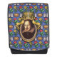 The Bard - The original artwork by ZoeSPEAK on this Backpack features a portrait of the author William Shakespeare. The portrait is in an ornate oval gold frame with ribbons and a crown on top. The blue background wallpaper is decorated with castles, kings' crowns and yellow and red flowers, bringing to mind the romance, tragedy and comedy of his plays and poetry.