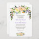 Le haut de cette jolie faire-part de mariage est agrémenté d'une image de demi-couronne fleurie couleur aquarelle. Les couleurs utilisées comprennent la mandarine, l'or, le jaune, le bleu, le violet, le vert et plus. Le bas de l'invitation a une image florale similaire. Votre texte personnalisé est en gris moyen et bleu violet au centre. Les images et le texte sont placés sur un élégant arrière - plan blanc, et le dos de l'invitation est également blanc. Beau, et les couleurs de cette invitation sont appropriées du printemps à l'automne.