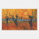Willows at Sunset by Vincent van Gogh is a vintage fine art post impressionism landscape nature painting. A glowing sun is setting behind a field of tall grass and a grove of pollard willow trees at sunset during the hot summer days. Beautiful autumn colours in warm tones of golden yellows, oranges and reds.