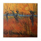 Willows at Sunset by Vincent van Gogh is a vintage fine art post impressionism landscape nature painting. A glowing sun is setting behind a field of tall grass and a grove of pollard willow trees at sunset during the hot summer days. Beautiful autumn colours in warm tones of golden yellows, oranges and reds.