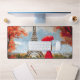 Une femme gracieuse avec un parapluie rouge se promène vers la Tour Eiffel dans une douce brise automnale. Charme parisien romantique dans les tons rouge et or.