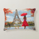 A graceful woman with a red umbrella strolls toward the Eiffel Tower in a soft autumn breeze. Romantic Parisian charm in glowing red and gold tones.