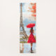 A graceful woman with a red umbrella strolls toward the Eiffel Tower in a soft autumn breeze. Romantic Parisian charm in glowing red and gold tones.