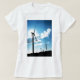 Wind turbine in the back light of the sun with blue sky and clouds.