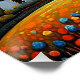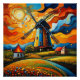 A.I. created print of a colorful windmill stands amidst rolling fields as a winding path leads through the lush landscape beneath the surreal sky and the setting sun.
