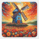 A.I. created print of a colorful windmill stands amidst rolling fields as a winding path leads through the lush landscape beneath the surreal sky and the setting sun.