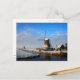 Photo postcard of a windmill next to a small river in the sunlight of a cold winter morning in a dutch countryside landscape with snow in the Netherlands.