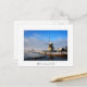 Photo postcard of a windmill next to a small river in the sunlight of a cold winter morning in a dutch countryside landscape with snow in the Netherlands with a white border and the text 'Holland'.