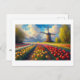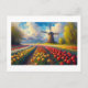 A scenic landscape features a historic windmill standing tall among vibrant fields filled with rows of multicolored tulips. Fluffy clouds dot a bright, blue sky accentuating the lush greenery and the peaceful ambiance of the scene.