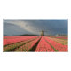 Photo print of a landscape with a windmill and pink tulip flowers in rows on a bulb farm under a grey sky in the countryside in the Netherlands in spring.