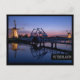 Postcard of two illuminated windmills and a drawbridge with reflection in the water of the canal in the last light at sunset in Kinderdijk in the Netherlands with a black edge and the text: 'Netherlands'.