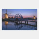 Rectangular photo sticker of two illuminated windmills and a drawbridge with reflection in the water of the canal in the last light at sunset in Kinderdijk in the Netherlands.